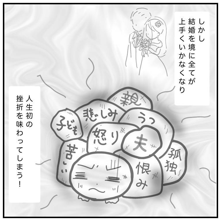 結婚を境に夫婦関係、子育て、親子関係、全てが思い通りにいかず、人生初の挫折を味わう。
